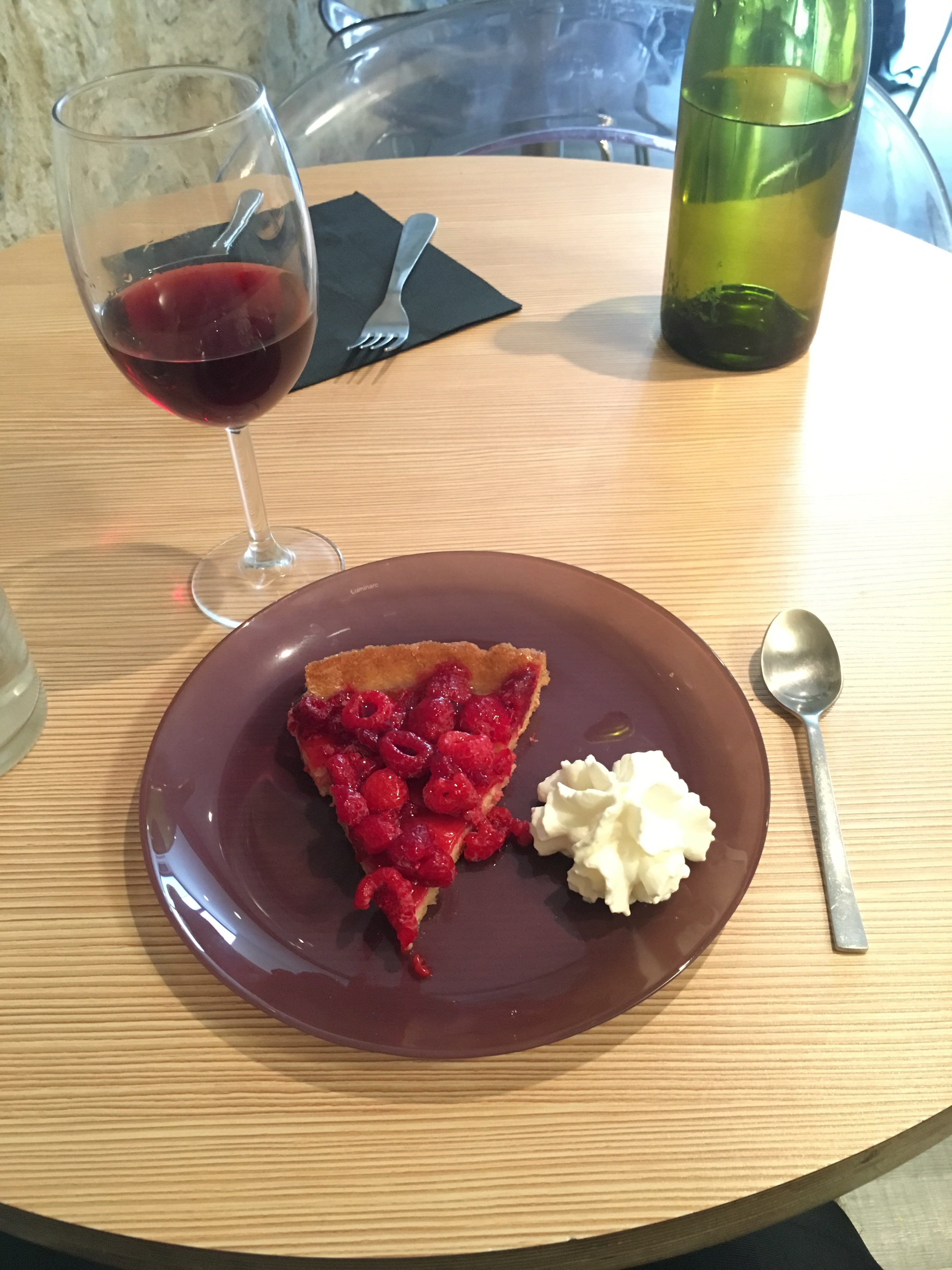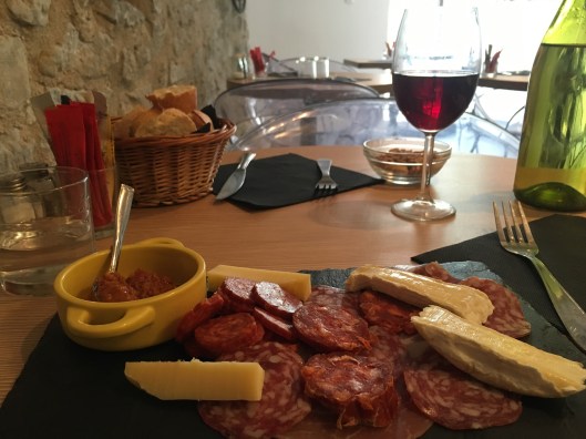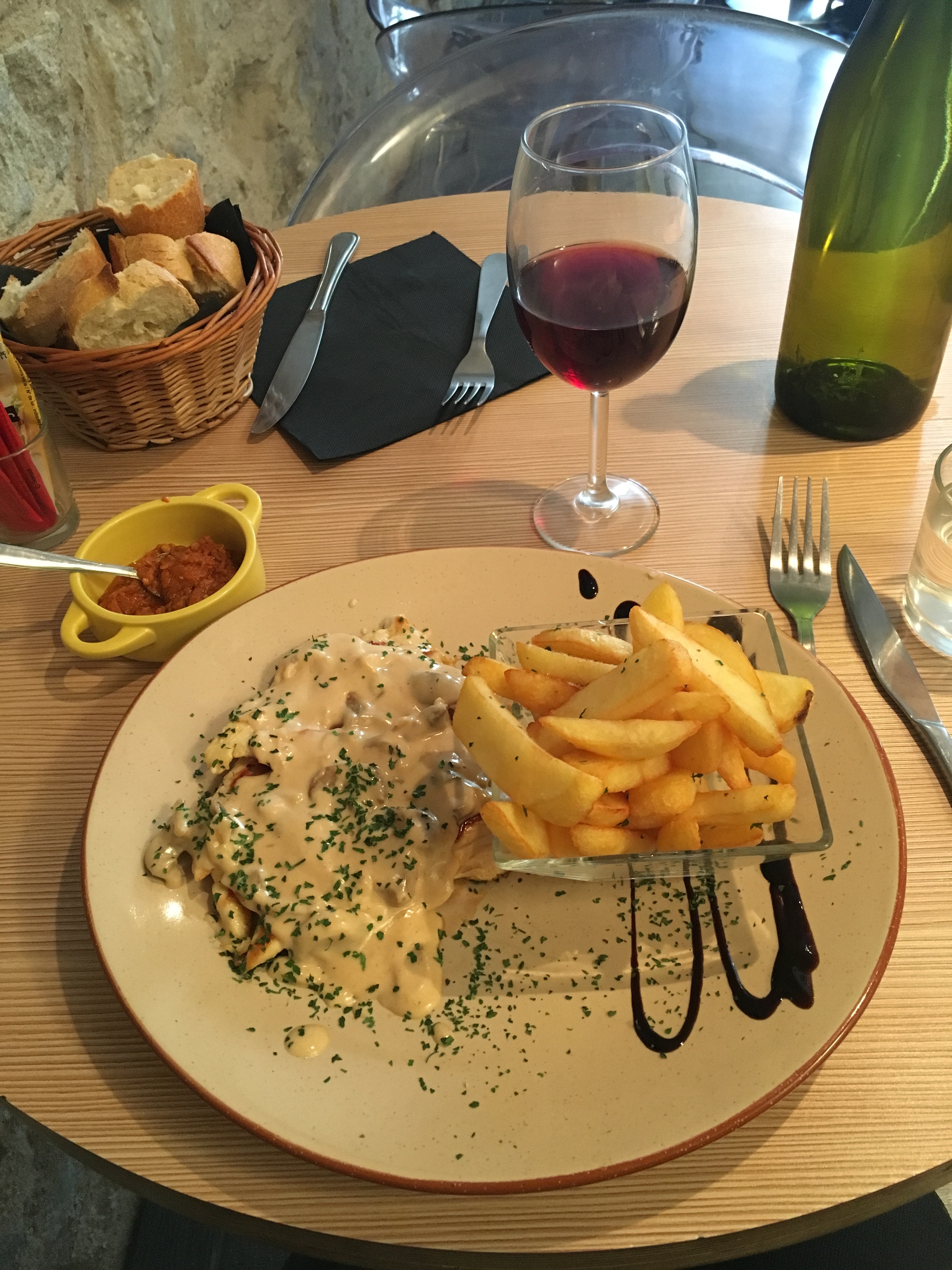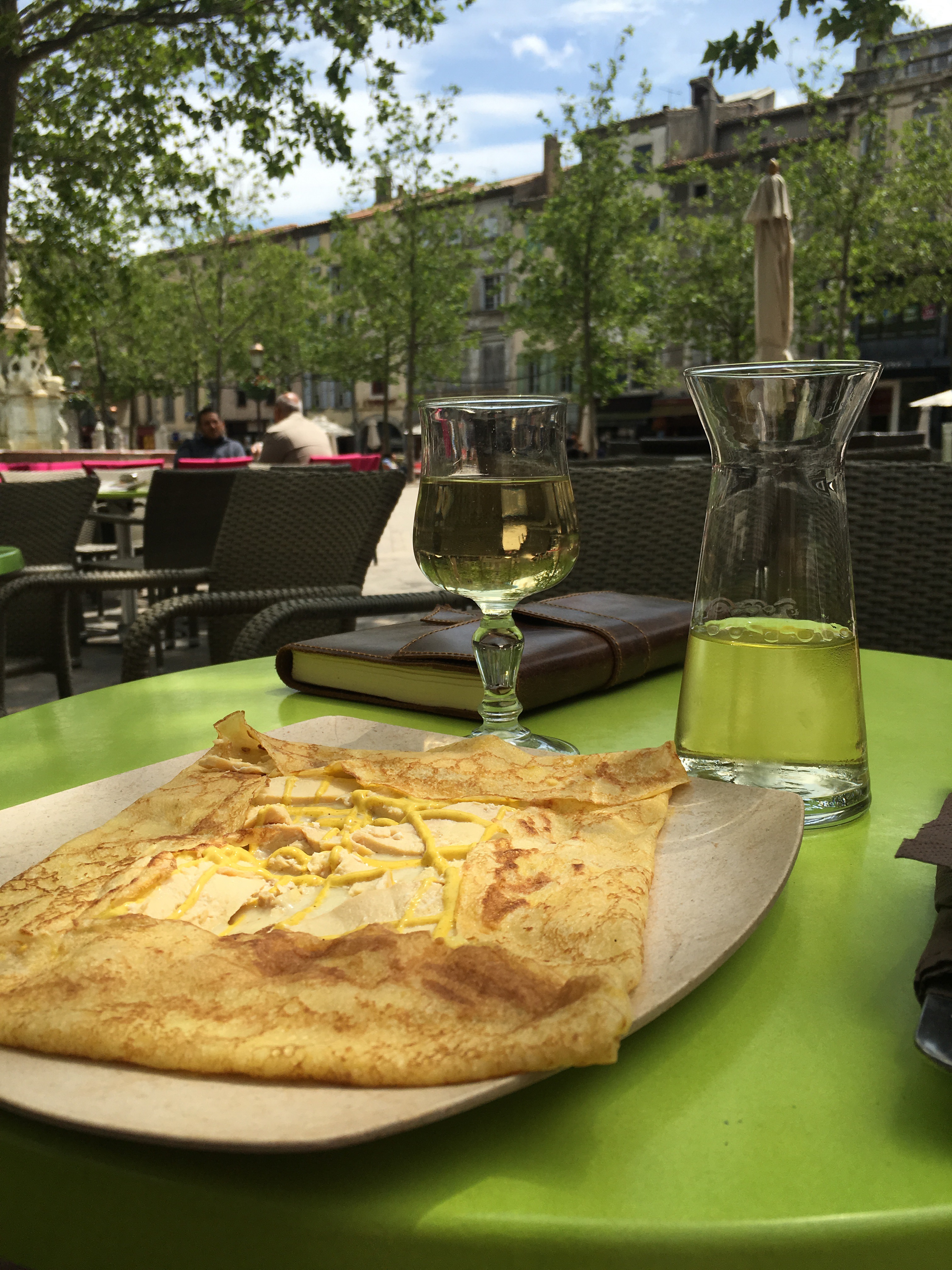 Lunch in the town’s central square… Crêpe with curry Chicken and white wine.